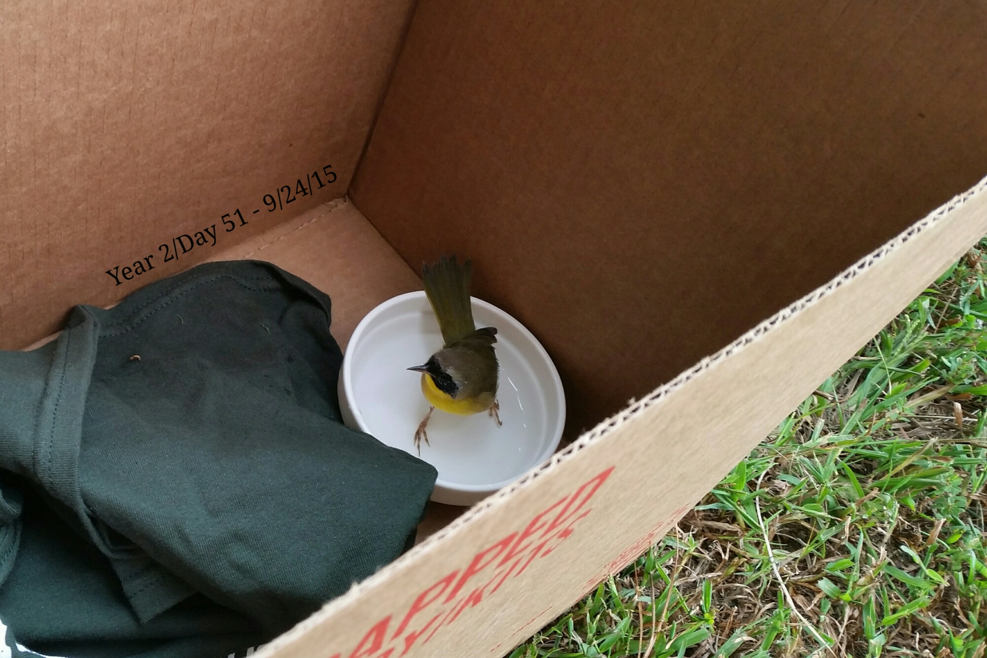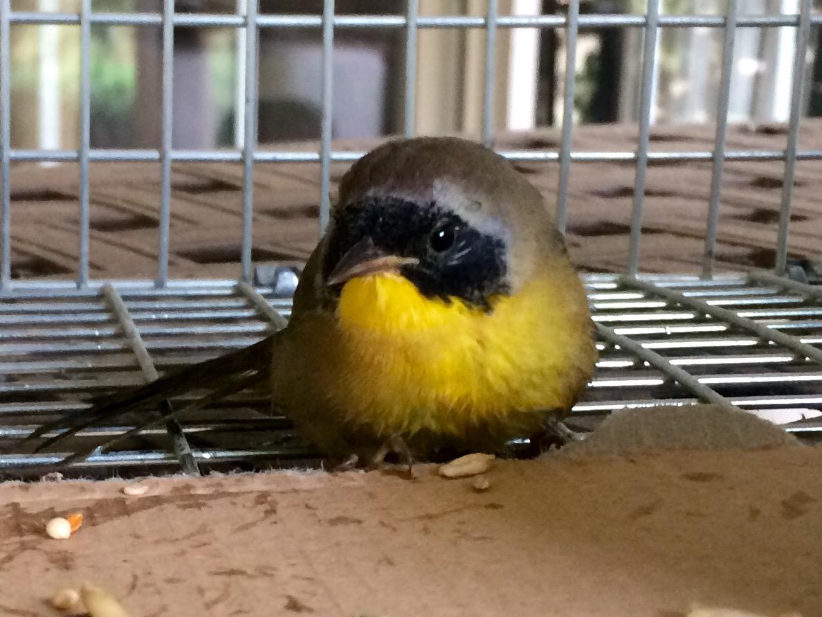 Apparently it ran into the glass window and gave itself a little birdie concussion. She kept him in a box for a little while. We tried to let it fly a few times, but it still wasn’t strong enough.